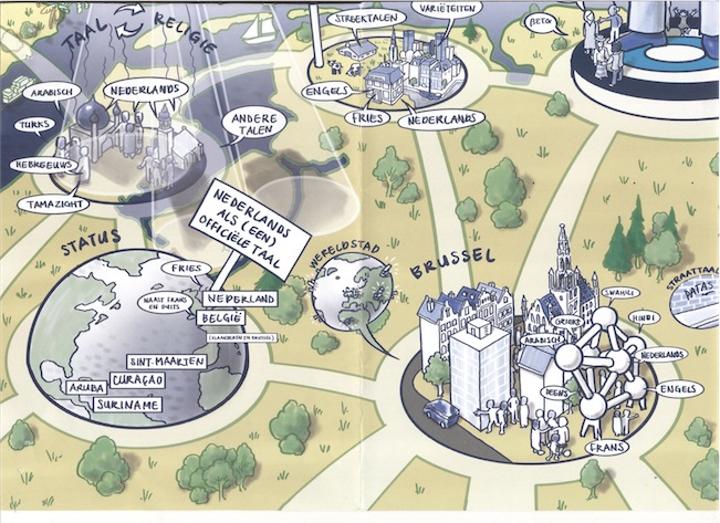 Anderzijds suggereert de folder dat stileringen in het Nederlands zoals omgangstaal, straattaal en etnolecten aparte talen zijn, want anders dan de streektaal-koeienstal krijgen zij ieder een knooppunt in de strip.